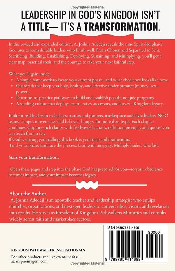 In this revised and expanded second edition, A. Joshua Adedeji maps the Spirit-led process God uses to shape ordinary believers into trusted Kingdom leaders—phase by phase. You’ll locate where you are (Chosen, Separated, Sent), embrace the costs (Sacrifice), and build what lasts (Build, Establish, Deploy), then learn how to sustain your calling and multiply other leaders for legacy.